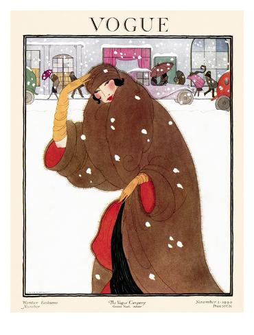 Shielded by her luxurious brown fur coat and matching turban, a woman on the move braves the cold winter wind. This snowy street scene, illustrated by Helen Dryden, appeared on the November 1, 1920, cover of Vogue. This giclée print offers beautiful color accuracy. Giclée (French for “to spray”) is a printing process where millions of ink droplets are sprayed onto the paper’s surface creating natural color transitions. The high-quality paper (235 gsm) is a great option for framing with its smooth, acid free surface. Price