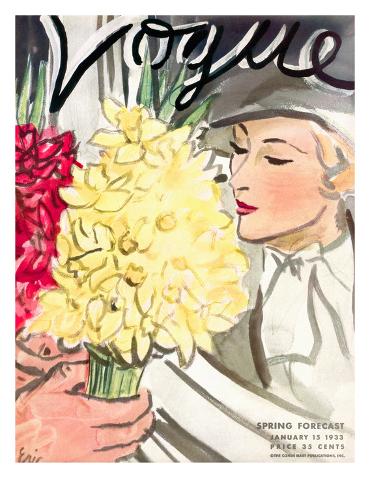 Leaning slightly through an open window, a woman takes in a delicate whiff of two spring bouquets, yellow and red. Carl Erickson's illustration appeared on the January 15, 1933, cover of Vogue. This giclée print offers beautiful color accuracy. Giclée (French for “to spray”) is a printing process where millions of ink droplets are sprayed onto the paper’s surface creating natural color transitions. The high-quality paper (235 gsm) is a great option for framing with its smooth, acid free surface. Price