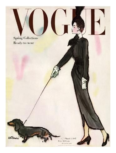 René Bouché chose a wonderfully simple theme for this cover: A tall woman, dressed to the nines in a high-waisted, long-sleeve black dress, white gloves, and feathered cap, takes her lively little black and brown dachshund for a walk. The illustration graced the March 1, 1947, cover of Vogue. This giclée print offers beautiful color accuracy. Giclée (French for “to spray”) is a printing process where millions of ink droplets are sprayed onto the paper’s surface creating natural color transitions. The high-quality paper (235 gsm) is a great option for framing with its smooth, acid free surface. Price