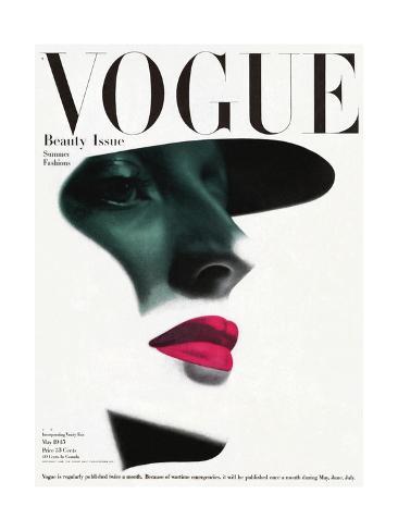 For the May 1, 1945, cover of Vogue magazine, photographer Erwin Blumenfeld simplified the details of a model's face. The vintage fashion cover depicts only the model's features, shadowed beneath a visor's teal shade, and her magenta pink lips. Blumenfeld uses the same reductive technique in his famous January 1, 1950 cover of Vogue, showing model Jean Patchett's eye and lips. This giclée print offers beautiful color accuracy. Giclée (French for “to spray”) is a printing process where millions of ink droplets are sprayed onto the paper’s surface creating natural color transitions. The high-quality paper (235 gsm) is a great option for framing with its smooth, acid free surface. Price
