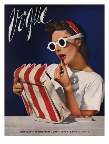 This light-hearted and patriotic cover was photographed by Horst P. Horst for the July 1, 1939, issue of Vogue magazine. It features the fashion model Muriel Maxwell, dressed in a white blouse, matching sunglasses, and applying red lipstick using the inside mirror of her red-and-white striped purse. This giclée print offers beautiful color accuracy. Giclée (French for “to spray”) is a printing process where millions of ink droplets are sprayed onto the paper’s surface creating natural color transitions. The high-quality paper (235 gsm) is a great option for framing with its smooth, acid free surface. Price