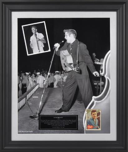 This stunning, extremely limited edition framed presentation features two photographs of Elvis from the Robert W. Dye collection taken in 1956 along with an actual Elvis trading card from 1956. Only 100 framed presentations will be produced. Please note that due to the scarcity of the cards, the card included in each frame may vary from the one shown in the photo here, but it will be an actual card from the 1956 Elvis card set.