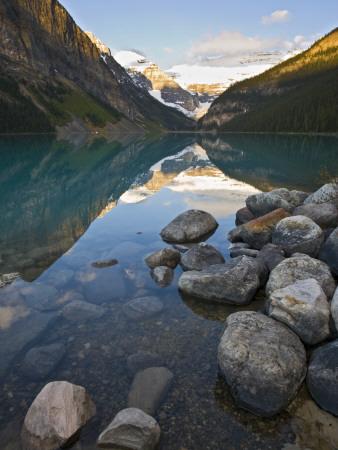Rocky Mountains and Boulders Reflected in Lake Louise, Banff National Park, Alberta, Canada