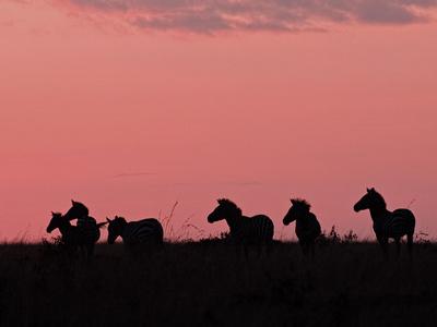 Burchell's Zebras Silhouetted in the Morning Sky of the Maasai Mara, Kenya