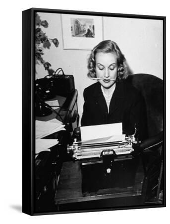 Actress Carole Lombard Typing While Holding Pencil Firmly in Her Mouth