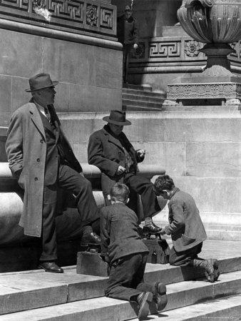 Shoeshine Boys Working on Businessmen's shoes on Front Steps of the New York Public Library