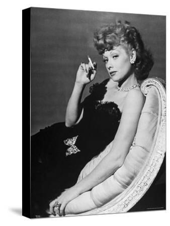 Dancer/Actress Lucille Ball in Strapless Black Lace Evening Dress, Holding Lit Cigarette on Couch