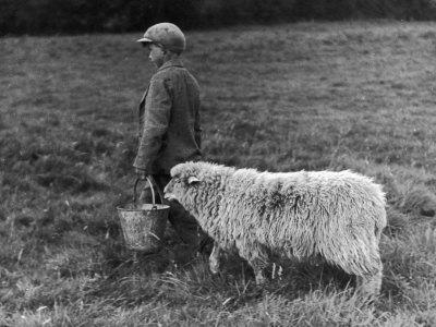 Little Boy Carring a Metal Pail of Feed is Followed by a Hungry Sheep!