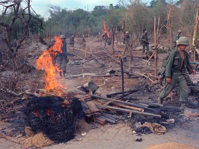 Following air strikes on a suspected Viet Cong position, U.S. troops burn remaining village structures and rice stacks in South Vietnam's Binh Duong province Jan. 10, 1966.<br>