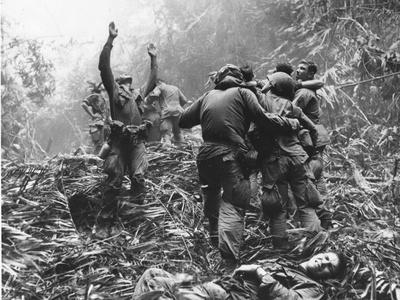 As fellow troopers aid wounded buddies a paratrooper of A Company st Airborne guides a medical evacuation helicopter through the jungle foliage to pick up casualties during a fiveday patrol of Hue South Vietnam in April br