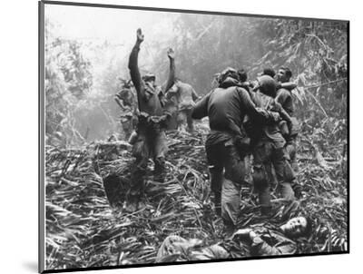 As fellow troopers aid wounded buddies a paratrooper of A Company st Airborne guides a medical evacuation helicopter through the jungle foliage to pick up casualties during a fiveday patrol of Hue South Vietnam in April br