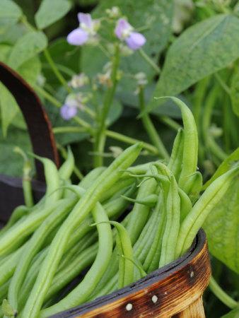 Dwarf Beans, 'Pongo' Harvested Crop in Rustic Trug with Plant and Flowers in Back, Norfolk, UK