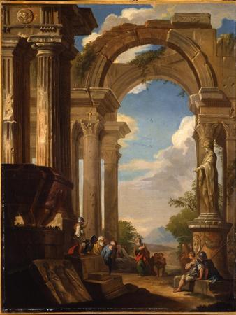 Capricci of Roman ruins with figures oil on canvas pair to Pannini or Panini Giovanni Paolo circle of Private Collection Photo Christies Images The Bridgeman Art Library