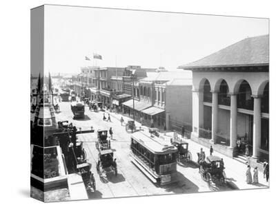 Carriages trolleys and pedestrians crowd a busy street in Kingston Jamaica