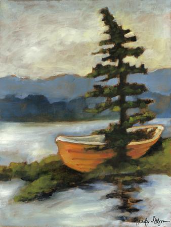 Jennifer Goldbergers Maine Escape I invites viewers to experience the serene beauty of a quiet lakeside scene. The composition features a vibrant orange canoe resting on a lush green patch near calm waters, with a tall evergreen tree anchoring the focal point. Subtle mountains and a soft sky in the background enhance the peaceful atmosphere, blending earthy tones with muted blues and greys. Goldbergers use of painterly brushstrokes and layered textures imbues the piece with a sense of tranquility and connection to nature. The soft, impressionistic style evokes a nostalgic appreciation for outdoor adventures and still moments by the water. This artwork makes an excellent addition to spaces where a calm, natural ambiance is desired, such as a living room, cabin retreat, or reading nook. Perfect for nature enthusiasts or anyone drawn to landscapes with a rustic charm.
