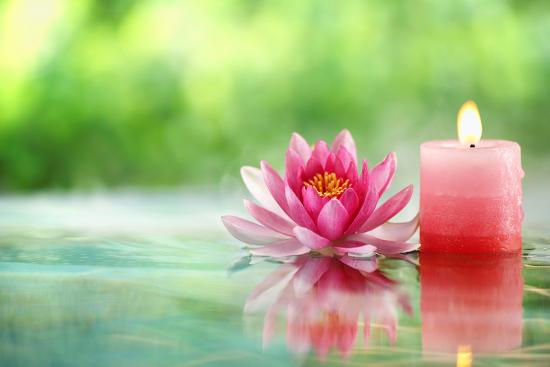 Burning Candle and Water Lily in Water. Photo Print
