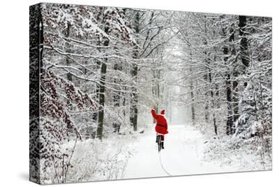 Father Christmas riding bicycle through beech woodland covered in snow and ice