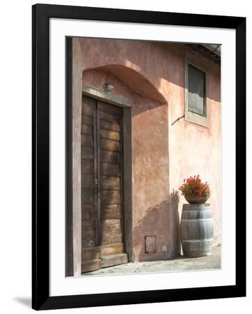 Europe, Italy, Tuscany. Flower Pot on Old Wine Barrel at Winery
