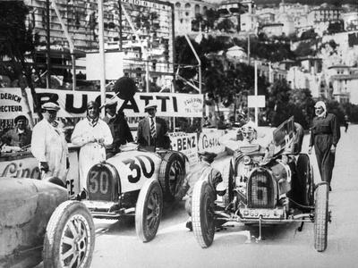 Scene during practice for the Monaco Grand Prix Competitors with their cars during practice for the inaugural Grand Prix at the famous street circuit The number car is the Bugatti of Mario Lepori who went on to finish th in the race which was won by W Williams William GroverWilliams also driving a Bugatti