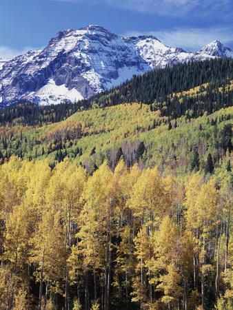 Colorado, Rocky Mts, Aspen Trees Below a Mountain Peak in Fall