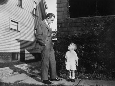 Father and Son Look at Each Other on Sidewalk, Ca. 1930.