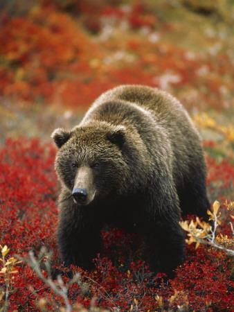 Grizzly Bear Standing Amongst Alpine Blueberries, Denali National Park, Alaska, USA
