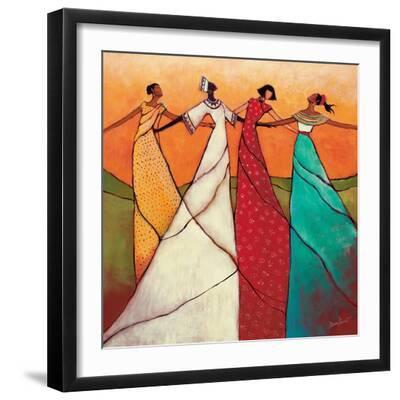 Monica Stewart brings vibrant energy to life through her artwork, showcasing themes of connection and togetherness. In this art prints, Unity, five women in colorful flowing dresses join hands in a joyful dance set against a warm orange background. The elongated figures and bold patterns highlight the artists signature style, blending abstract and figurative elements to create a sense of movement and harmony. The Unity wall art print celebrates the beauty of diversity and the power of shared experiences. The rich hues of red, turquoise, and gold, contrasted with softer whites, add warmth and vitality to any space. Monica Stewart, known for her depictions of AfricanAmerican culture and community, inspires a sense of inclusion and celebration through her work. This piece is perfect for adding a dynamic and uplifting focal point to living rooms, offices, or creative spaces.