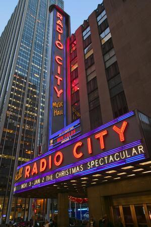 Neon lights of Radio City Music Hall at Rockefeller Center, New York City, New York