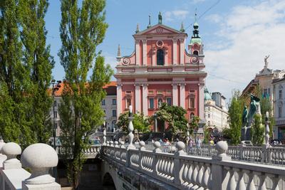Ljubljana, Slovenia. Presernov trg (or square) and the Baroque Franciscan Church of the Annuncia...