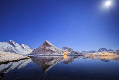 Full moon and stars light up snow capped peaks reflected, Volanstinden, Fredvang, North Norway