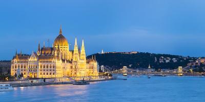 Hungary, Central Hungary, Budapest. Chain Bridge and the Hungarian Parliament Building on the Danub