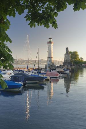 Lighthouse and Bavarian Lion at the port at sunset, Lindau, Lake Constance, Bavaria, Germany, Europ
