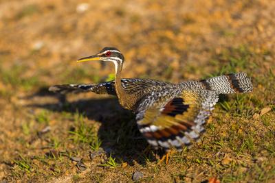 A Splendid Sunbittern spreads its wings along the bank of a river in the Pantanal, Brazil