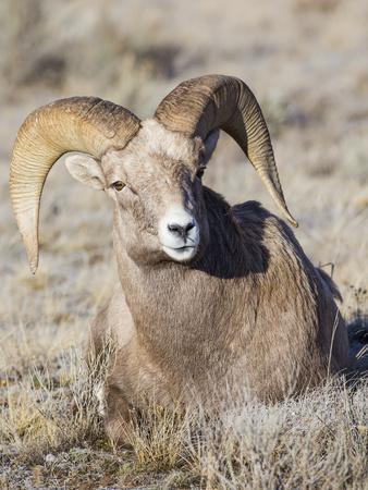 USA, Wyoming, National Elk Refuge, Bighorn sheep ram lying down on frosty grasses
