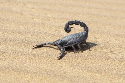 Namibia, Swakopmund. Black scorpion moving across the sand.