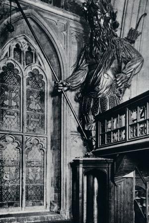 'Gog (Gogmagog), One of the two City giants burnt in the London Guildhall fire of Sunday December 29th, 1940'. Gog and Magog, are associated with Guildhall. Legend has it that the two giants were defeated by Brutus and chained to the gates of his palace on the site of Guildhall. The earliest versions of Gog and Magog were destroyed during the Great Fire of London. They were replaced in 1708 by a pair of wooden statues carved by Captain Richard Saunders. It was these giants that were destroyed in the Blitz. From The Connoisseur, 1941 edited by H. Granville Fell. [The National Magazine Co. Ltd, London, 1941]