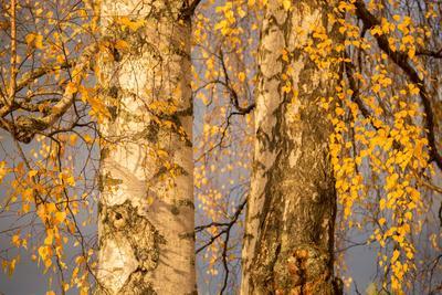Birch tree trunks and branches with yellow leaves, blue gray sky on background
