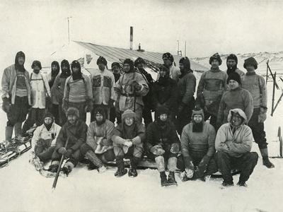 The Main Party at Cape Evans After The Winter, 1911. 'Mr. Taylor. Mr. Cherry-Garrard. Mr. Day. Mr. Nelson. Lieut. Evans. Capt. Oates. Dr. Atkinson. Capt. Scott. Mr. Wright. Lieut. Gran. Keohane. Lashly. Hooper. Forde. Anton. Demetri. Lieut. Bowers. Mr. Meares. Mr. Debenham. Dr. Wilson. Dr. Simpson. Seaman Evans. Crean.' The final expedition of British Antarctic explorer Captain Robert Falcon Scott (1868-1912) left London on 1 June 1910 bound for the South Pole. The Terra Nova Expedition, officially the British Antarctic Expedition (1910-1913), included a geologist, a zoologist, a surgeon, a photographer, an engineer, a ski expert, a meteorologist and a physicist among others. Scott wished to continue the scientific work that he had begun when leading the Discovery Expedition to the Antarctic in 1901-04. He also wanted to be the first to reach the geographic South Pole. Scott, accompanied by Dr Edward Wilson, Captain Lawrence Oates, Lieutenant Henry Bowers and Petty Officer Edgar Evans
