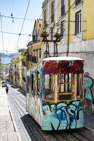 This image was created by Philippe Hugonnard. It's the funicular of Bica with graffiti in the street Da Bica in Lisbon with colourful facades in Portugal.