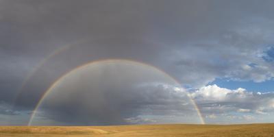 View of a double rainbow over steppe grassland, Mongolia, 2018