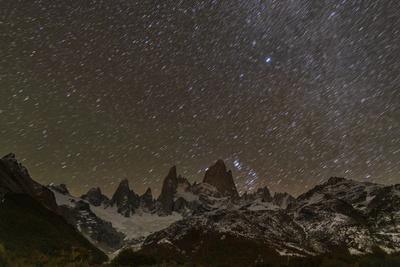 Mount Fitz Roy and Cerro Torre at night with star trails, El Chalten, Patagonia, Argentina
