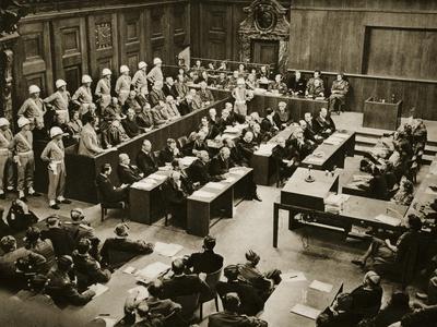 The dock at the Nuremberg Trials Front row from left Hermann Goring standing Rudolph Hess behind Goring Joachim von Ribbentrop Wilhelm Keitel Ernst Kaltenbrunner Alfred Rosenberg Hans Frank Wilhelm Frick Julius Streicher Walther Funk Dr Hjalmar Schacht Back row from left Karl Donitz Erich Raeder Baldur von Schirach Fritz Sauckel Alfred Jodl Franz von Papen Arthur SeyssInquart Albert Speer Konstantin von Neurath Hans Fritzsche November October bw photo Private Collection The Stapleton Collection The Bridgeman Art Library