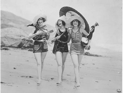 Frolicsome Trio of American Bathing Beauties Wearing the Latest Swimsuit Costumes