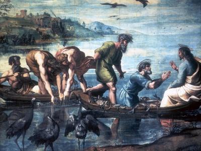 The Miraculous Draught of Fishes Jesus sits in one of the boats asking Peter to give up fishing and to become his disciple a fisher of men Jesus performs a miracle and the nets are so full of fish that the men have difficulty hauling them in Cranes in the foreground wait for a free easy meal Painted as a cartoon for the Brussels tapestry weavers from the Victoria Albert Museum London