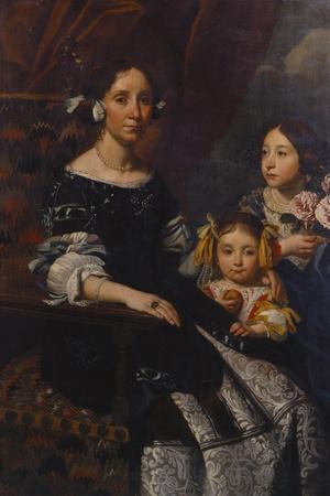 Portrait of a Lady, Seated Three-Quarter Length, in a Blue and White Dress, with Two Young…