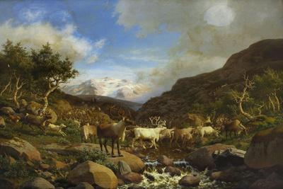 A Herd of Reindeer Fording a Stream in a Mountainous Landscape Giclee Wall Art