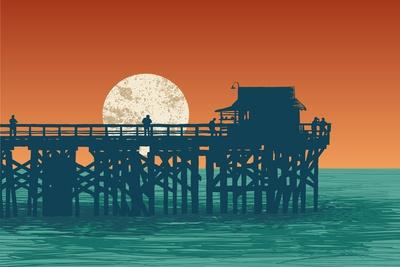 Oceanic View with Silhouette Pier and Full Moon. Vector Illustration.