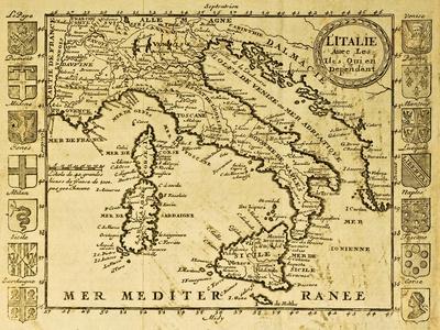 Map Of Italy Framed By Territorial Crests. May Be Dated To The Beginning Of Xviii Sec Wall Art Print