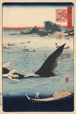 Utagawa Hiroshige Hizen goto kujiraryo no zu Date CreatedPublished Color woodcut print x cm Whalers armed with harpoons hunting whales From the series Shokokumreisho hyakkei One hundred famous views of the country