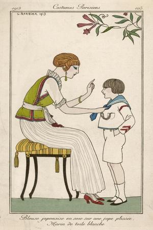 Woman: Narrow Pleated Skirt, Japonaise Silk Blouse, Short Sleevless Tunic and Sash